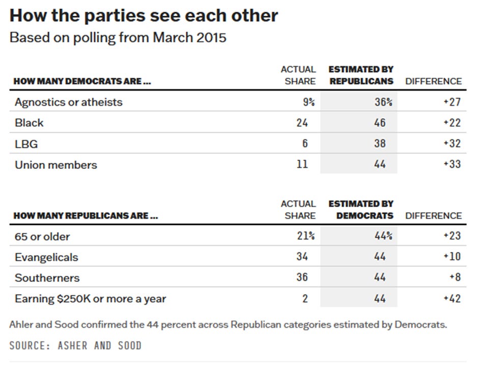 “We are in a situation where Americans have sorted themselves into two parties along not just ideological lines, but also by geographical, religious, racial and other social and cultural differences. At the same time, they’ve adopted inaccurate, caricatured views of both parties that overstate these already sizable demographic differences. And they’ve started taking positions on issues based on whatever stance their party adopts.”