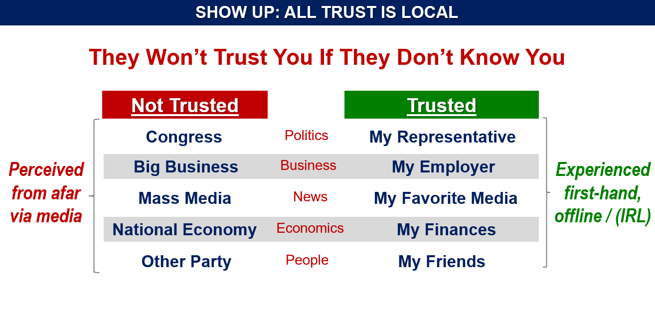 The radical transparency enabled by the internet has precipitated a profound crisis of authority — people no longer trust big institutions to have their back — they feel “let down by people who ‘run things’” and they’re voting for change. Yet trust is a funny thing. People hate Congress but trust their own Congressperson. They don’t trust big business (Gallup) but trust their own employer most (Edelman Trust Barometer). We don’t trust the “mass media” but trust the podcasters we listen to & Substacks we read. We have confidence in our own doctor but despise the “healthcare system.” Why? It’s based on how we engage them. We don’t trust those things we perceive from afar, through the lens of a media incentivized to keep us reading, watching and listening via drama & outrage… “if it bleeds it leads.” By contrast we trust those things we experience in real life, first hand, offline. If you want to be trusted, you need to show up… to tell your own story