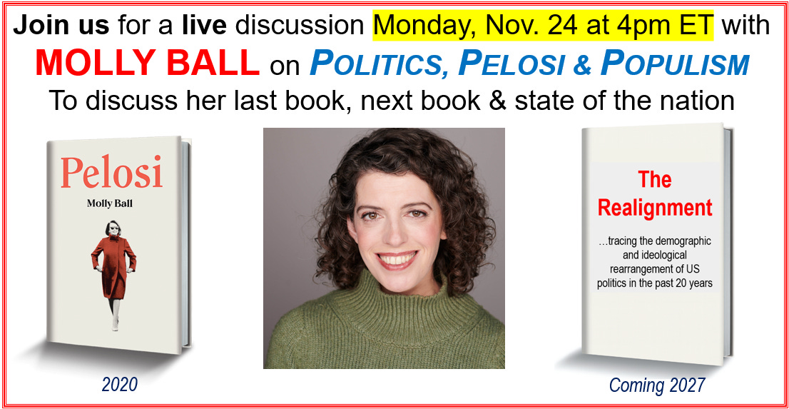 Upcoming live discussion… Join us Monday Nov. 24 (tomorrow!) at 4pm ET… award-winning national political correspondent MOLLY BALL discusses “Pelosi, Politics & Populism”… register here.